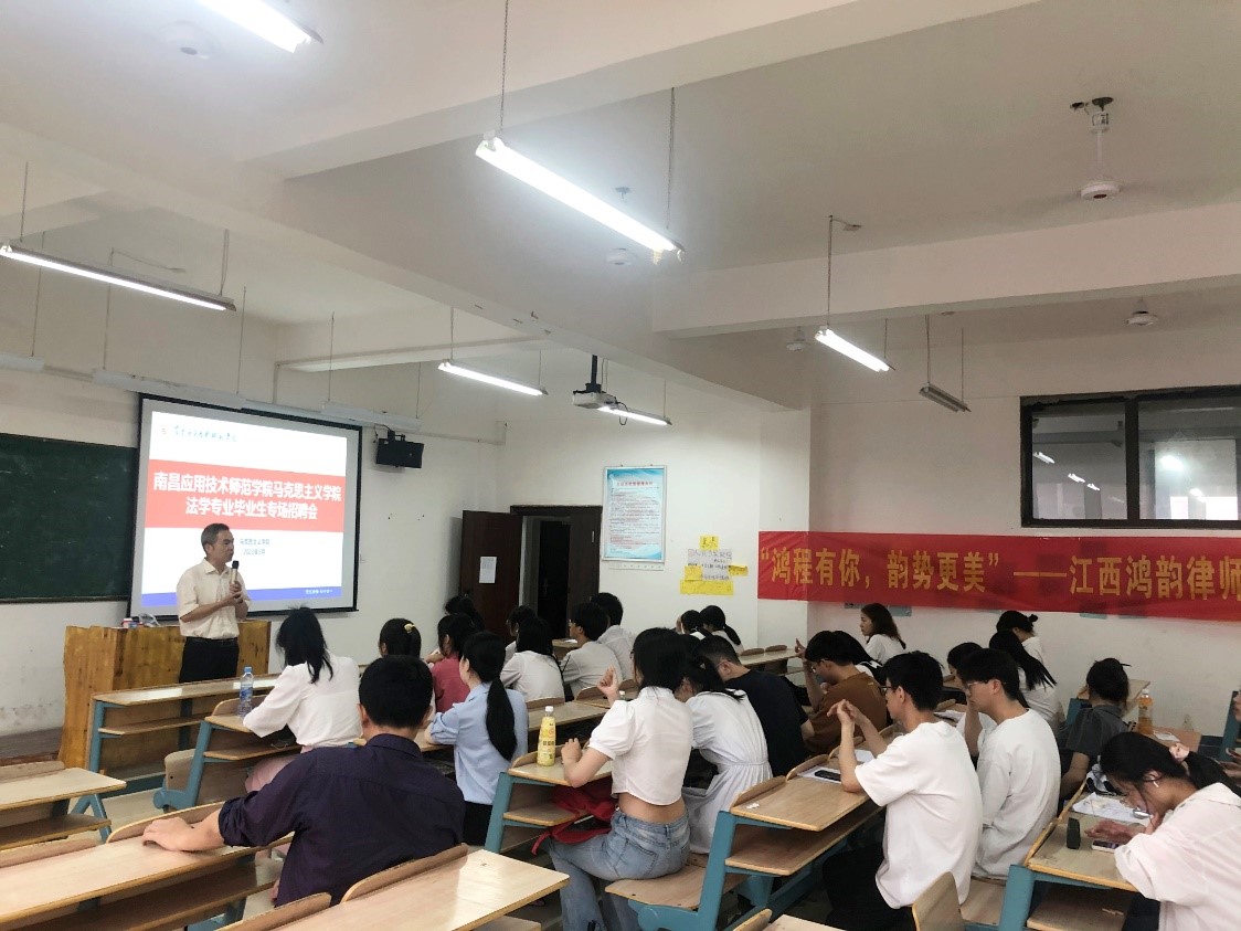 就业是民生之本,是经济发展的基石。为促进必赢官网毕业生更好就业,2023年5月17日下午4点半,学院在教学楼3307教室,组织了法学专业毕业生专场招聘会,招聘方为江西鸿韵律师事务所。