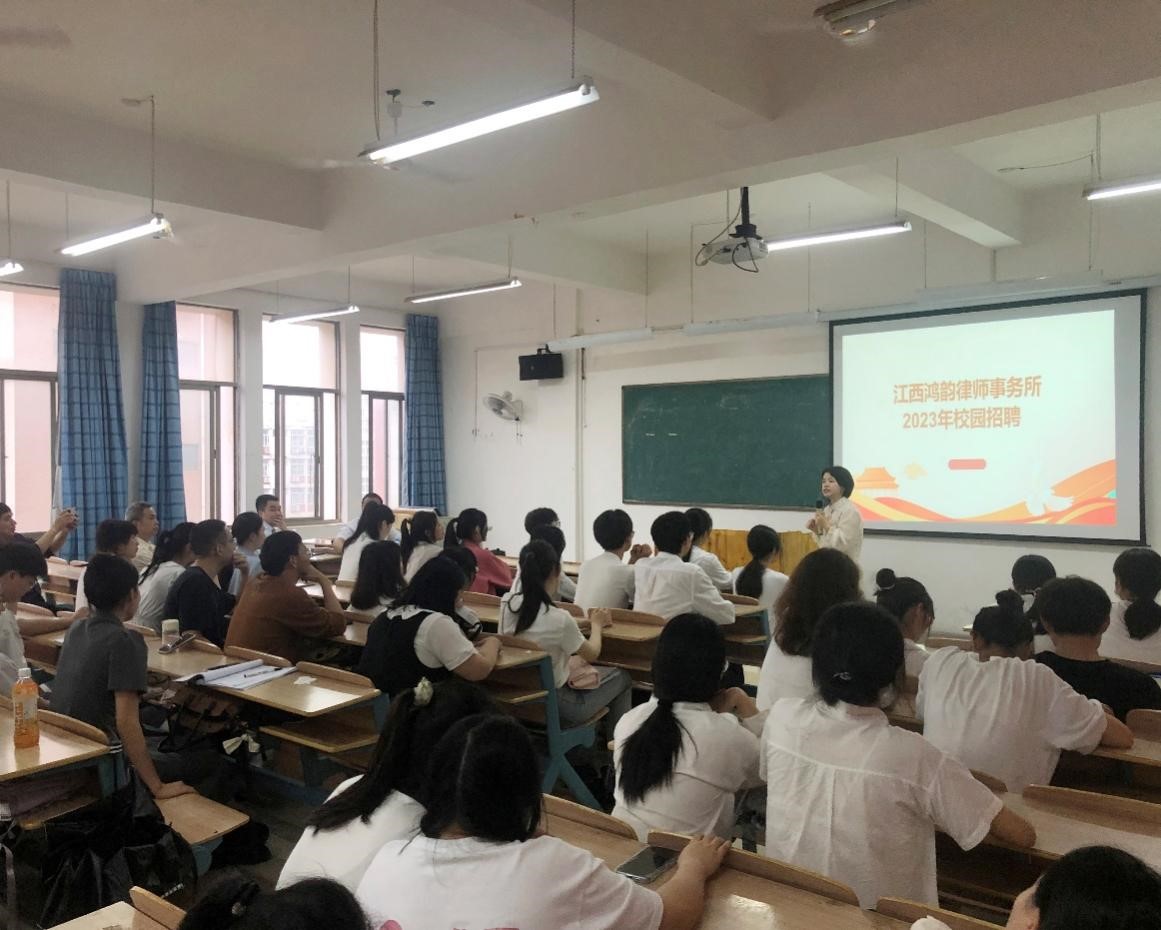 首先由江西鸿韵律师事务所袁小红律师进行宣传,大致讲解了法学毕业生的就业方向,以及就业选择,说到什么样的人适合什么样的岗位,并且鼓励毕业生们积极就业。随后,由江西鸿韵律师事务所施远涛律师进行宣传,讲解了其律所的基本情况,有保障的基本薪资和优厚的绩效酬金,坚强的团队和丰富的案源供给,不设天花板,开放的合伙人制度,其后对招聘人才要求进行解说,并鼓励必赢官网法学生毕业生积极向其所投放简历。