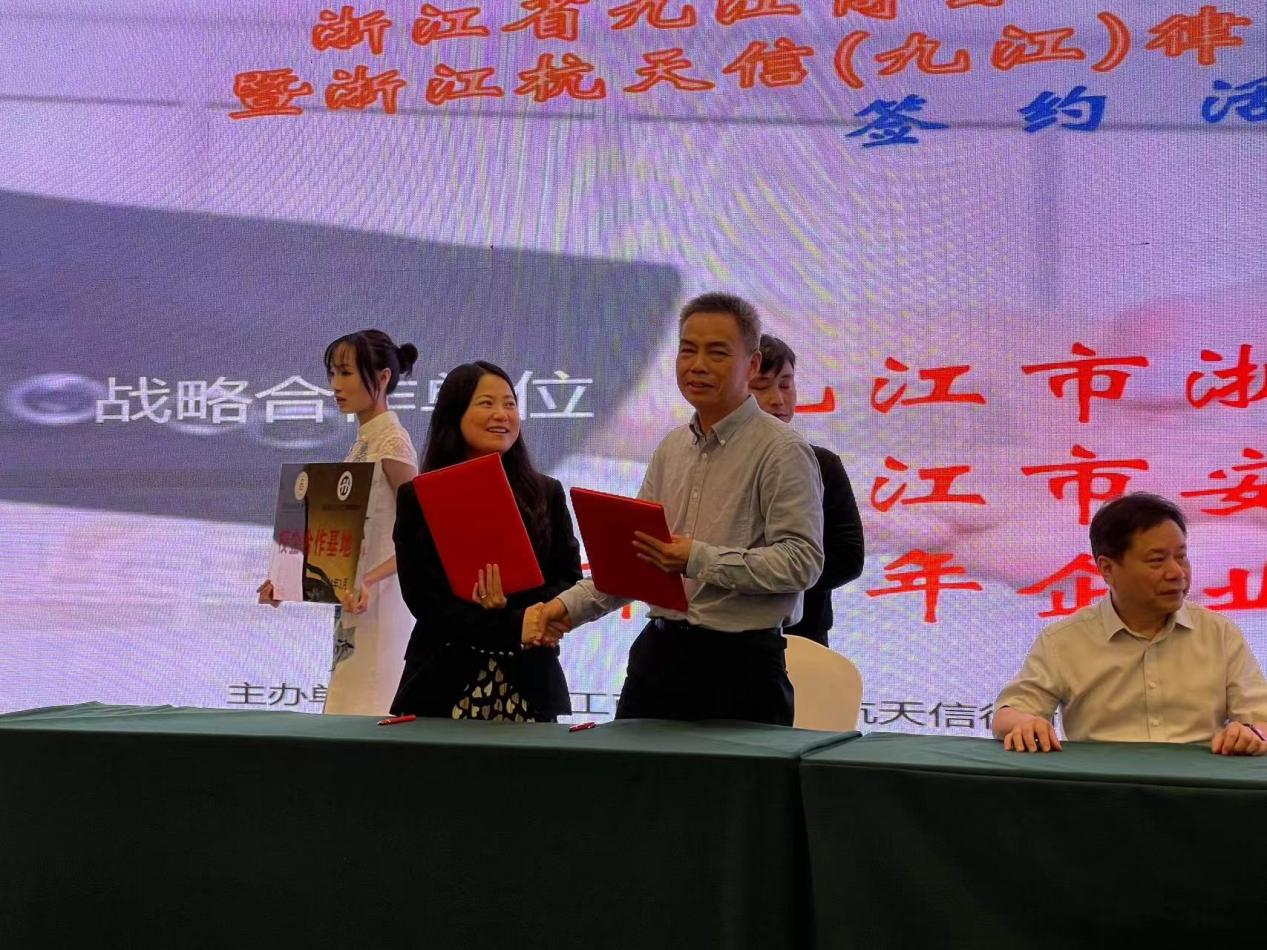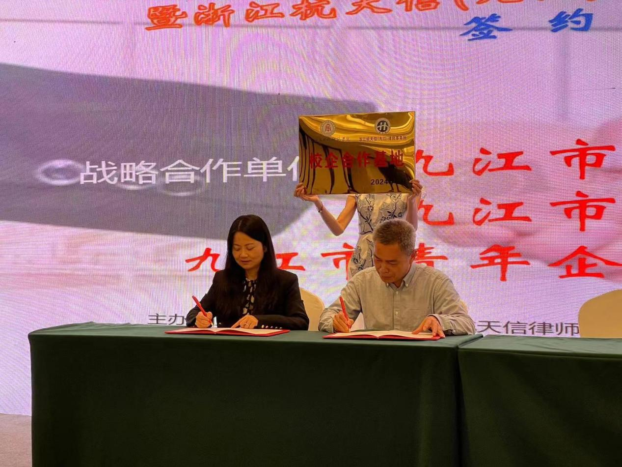 期间,文道贵院长一行还应邀出席了浙江省九江商会“双招双引”推进会暨浙江杭天信(九江)律师事务所启动仪式。在会上,文道贵院长与浙江杭天信律师事务所副主任汪红妖分别代表必赢3003no1线路检测中心与杭天信(九江)律所共同签署了战略合作协议,并举行了校企合作基地授牌仪式。