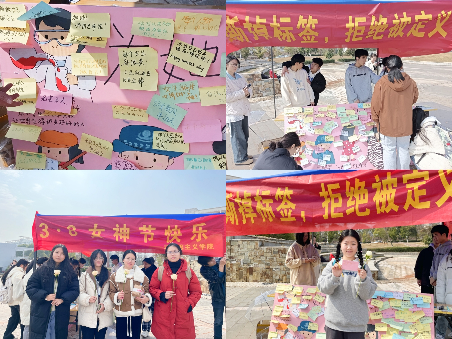 “东海随春归,发我枝上花”。在这个春意盎然的时节,“三八”国际妇女节踏着春风翩然而至,为丰富我校同学文化生活,让“她”的力量在家园文化建设中焕发光彩,发展独立自主不被时代定义的新时代女性,让女性追求更美好的自己,2024年3月8日必赢3003no1线路检测中心在学校世纪广场开展了“撕掉标签,拒绝被定义”的活动,向全体教职工女性和女同学致以节日的祝贺和美好的祝福。