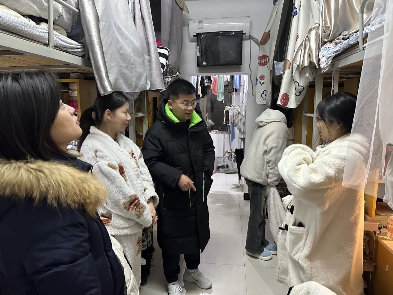 为深入加强师生交流、了解学生备考情况、切实解决学生所遇到的实际问题。12月19日晚,在学校第一次党员大会即将召开之际,必赢3003no1线路检测中心党总支书记张欣康、副书记李婷携全体辅导员深入学生宿舍走访,给予学生在生活与学业上的关心关爱。