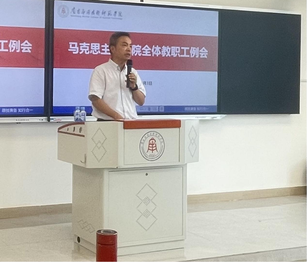 会上,文道贵首先向全体教职工介绍了本学期新进的教师们。他强调新教师们的加入,壮大了学院师资队伍,为学院注入了新的能量,希望新进的教师能够迅速融入这个温暖的集体,与老教师一起携手共进,共同为学院的发展贡献力量。他还通报了自开学以来学院教师的排课及教学运行情况,学院各项工作平稳运行中,并表扬了在本次迎新工作中表现突出的教职工。