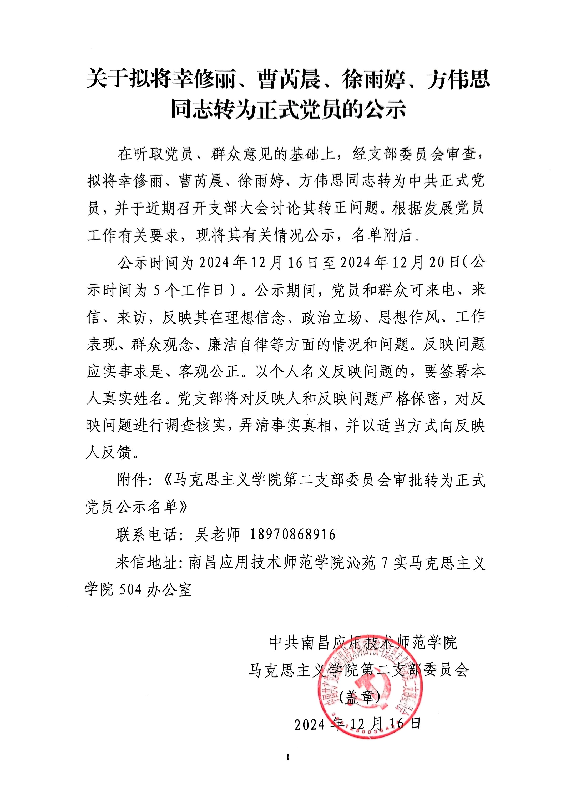 首页栏目 通知公告 学院新闻 习近平思想学习专栏 主题教育学习 院长书记信箱 您现在的位置是:首页 > 首页栏目 > 通知公告 关于拟将幸修丽、曹芮晨、徐雨婷、方伟思同志转为正式党员的公示 党政办2024-12-162570 下一篇 关于确定胡琛为2024 年度宣传思想文化工作 “先进个人”的公示