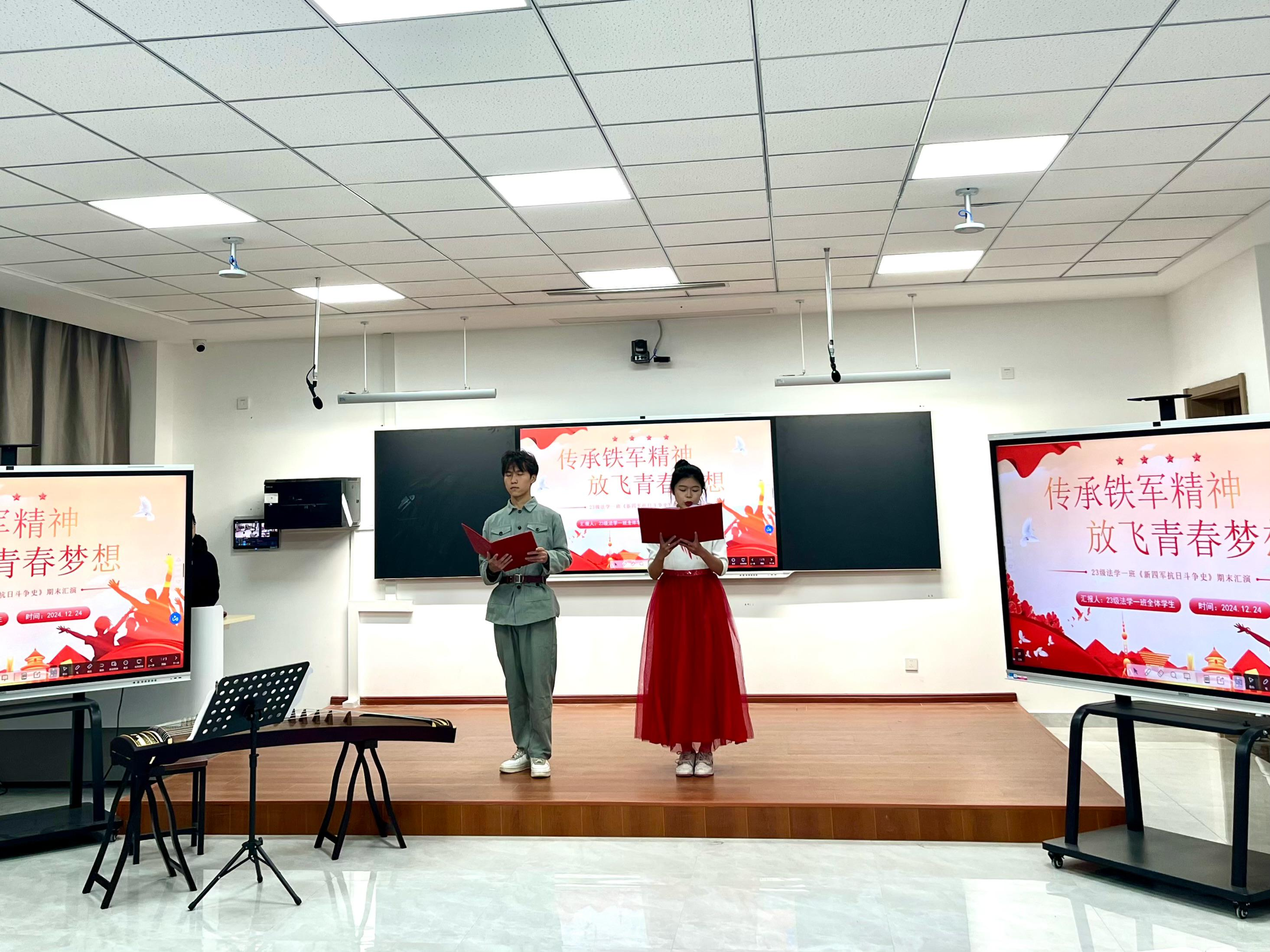 本次汇报展示活动完全由法学23级1班同学在王敬平教授等任课老师的指导下自编自导,由李司翰和戴璇同学主持。活动在全体师生激昂的《新四军军歌》合唱声中拉开帷幕。随后,同学们将所学转化为实践,以华中抗日根据地新四军七个师的传奇经历与英勇抗日斗争故事为蓝本,分7个小组自主创作并演绎了一系列精彩节目。从第1组的诗朗诵《烽火铁军魂—致新四军第一师》与歌唱《映山红》,到第2组的自创散文朗诵、《桃花谣》歌唱表演,到第3组舞台剧抗日英雄徐佳标的英雄事迹,从第5组朗诵+舞台剧《不朽》、第6组的朗诵《新四军赋》再到第7组的深情颂词《皖江的英雄儿女.七师颂》,每个节目都栩栩如生、精彩夺目,每句台词、每个表演环节都饱含着同学们对革命先辈为了国家和民族利益不屈不饶、英勇反抗外敌入侵的历史及其凝聚的新四军革命精神的深刻理解与高度敬佩。