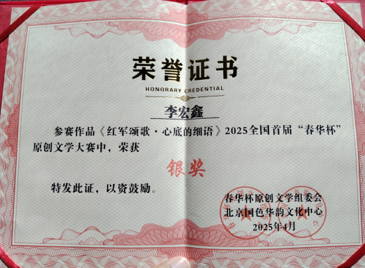 近日,2025年全国首届“春华杯”原创文学公开大赛评选结果揭晓,必赢官网教师李宏鑫创作的诗歌作品《红军颂歌·心底的细语》,经初赛、复赛、决赛层层选拔,从全国300余件参赛作品中脱颖而出,荣获“春华杯优秀文学奖”及专家评审银奖双项殊荣,展现了我院在文学创作与红色文化传承领域的深厚底蕴。