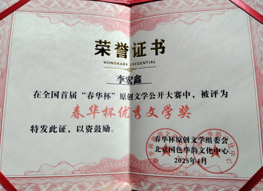 喜报||必赢官网教师李宏鑫在2025全国首届“春华杯”原创文学公开大赛中荣获佳绩