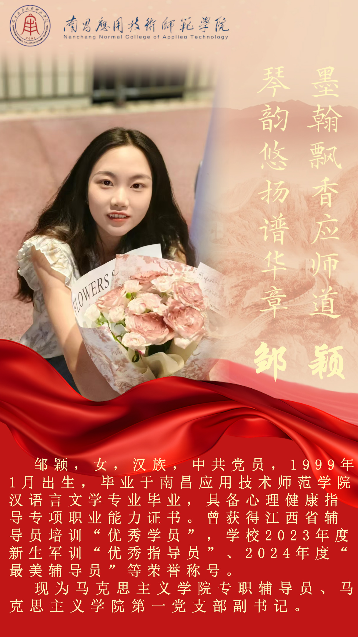 先进典型 优秀毕业生 优秀在校生 优秀教职工 您现在的位置是:首页 > 先进典型 > 优秀教职工 邹颖 最美辅导员 管理员2025-04-171342 上一篇 戴瑞轩 思想政治教育系主任 下一篇 李宏鑫 先进工作者
