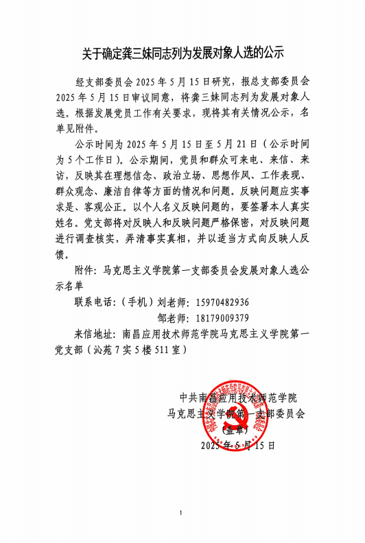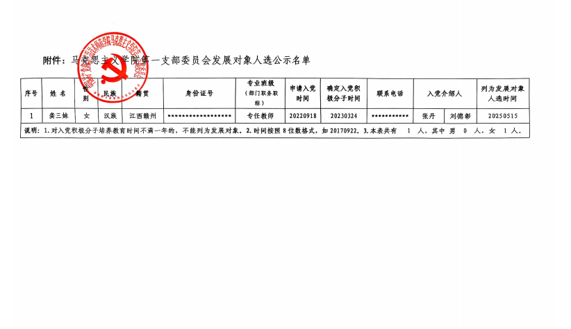党建活动 组织发展 党总支概况 党建工作 您现在的位置是:首页 > 党建活动 > 党建工作 关于确定龚三妹同志列为发展对象人选的公示 党政办2025-05-151337 上一篇 关于将吴克坤等8位同志列为发展对象人选的公示 下一篇 学院召开党总支理论学习中心组(扩大)学习会议