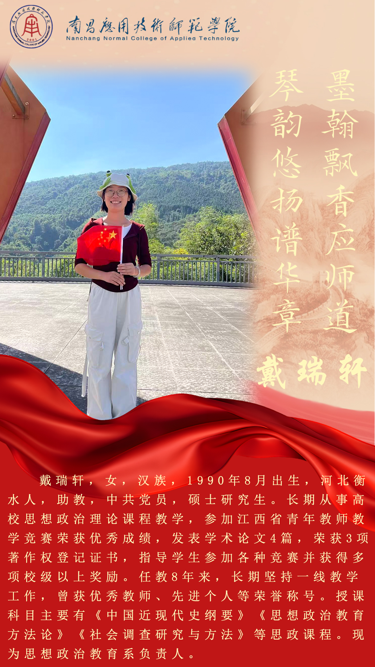 先进典型 优秀毕业生 优秀在校生 优秀教职工 您现在的位置是:首页 > 先进典型 > 优秀教职工 戴瑞轩 思想政治教育系主任 管理员2025-06-091276 上一篇 龚三妹 法学系主任 下一篇 邹颖 最美辅导员
