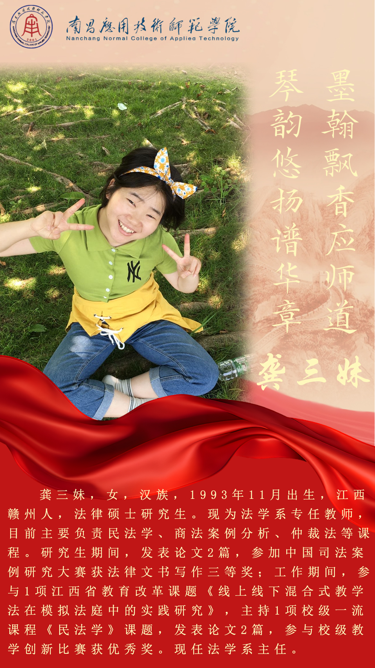 先进典型 优秀毕业生 优秀在校生 优秀教职工 您现在的位置是:首页 > 先进典型 > 优秀教职工 龚三妹 法学系主任 管理员2025-06-091276 上一篇 李婷 思想政治教育公共课系主任 下一篇 戴瑞轩 思想政治教育系主任