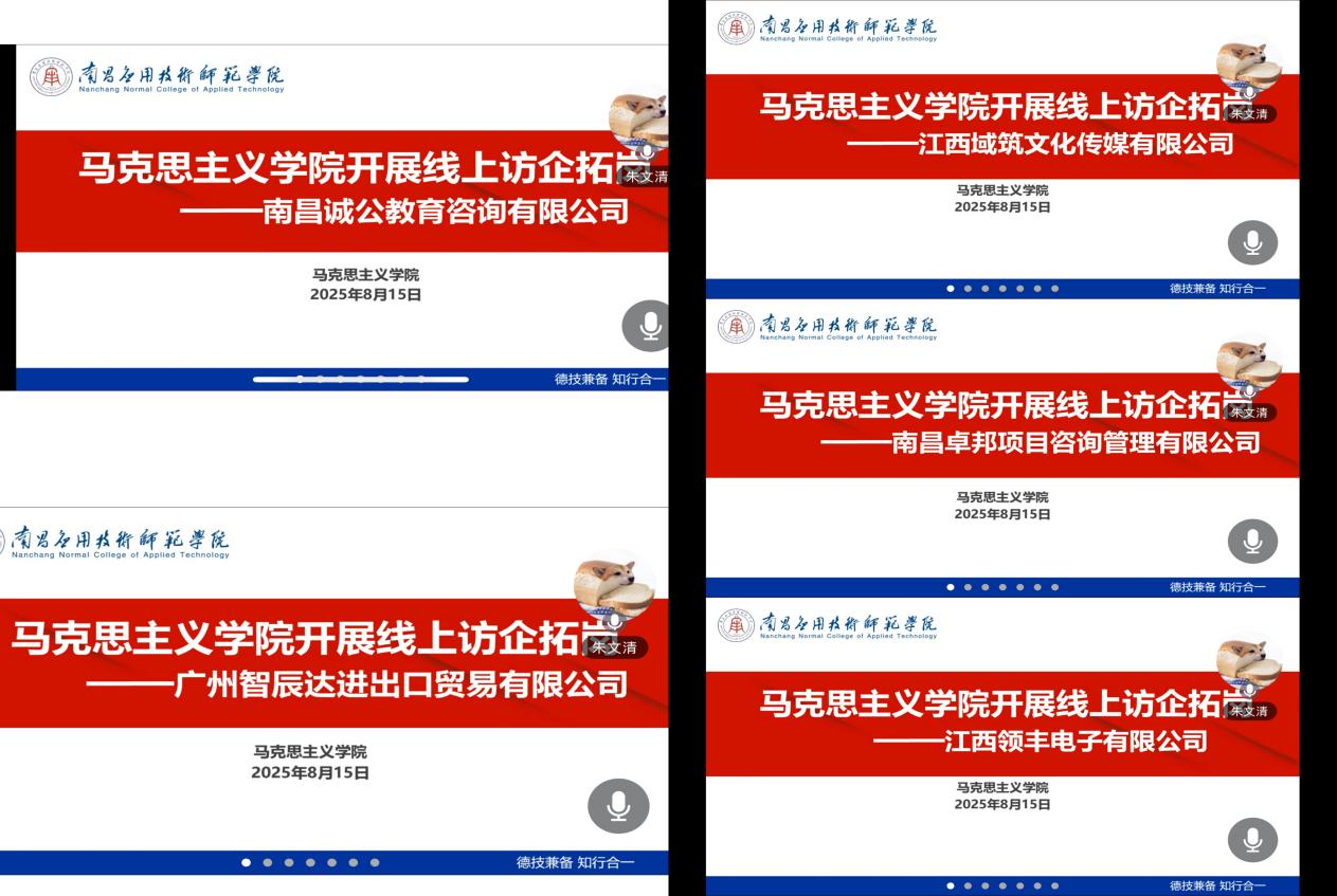 为拓宽毕业生就业渠道,强化校企合作,给学生提供更广阔的职业发展空间,8月15日,必赢3003no1线路检测中心党总支书记张欣康通过视频形式对南昌诚公教育咨询有限公司、广州智辰达进出口贸易有限公司、江西域筑文化传媒有限公司、南昌卓邦项目咨询管理有限公司、江西领丰电子有限公司进行访问,双方就人才培养、实习实训、就业指导等方面进行了深入交流,并达成了一系列合作意向。