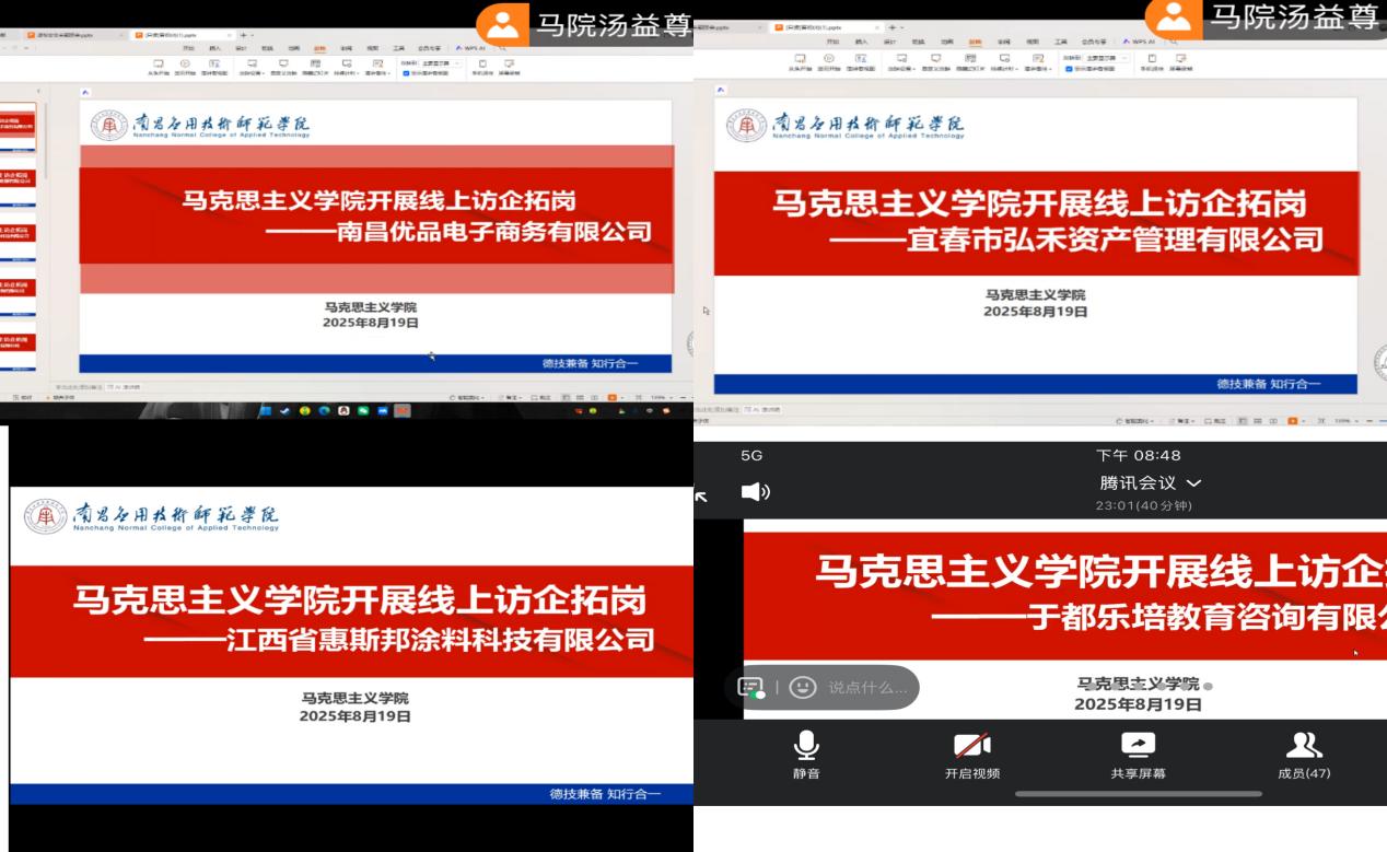 为进一步拓宽毕业生就业渠道,加强校企合作,促进学生高质量就业,必赢3003no1线路检测中心于2025年8月19通过视频会议的方式与南昌优品电子商务有限公司、宜春市弘禾资产管理有限公司、江西省惠斯邦涂料科技有限公司、于都乐培教育咨询有限公司开展了线上访企拓岗活动。
