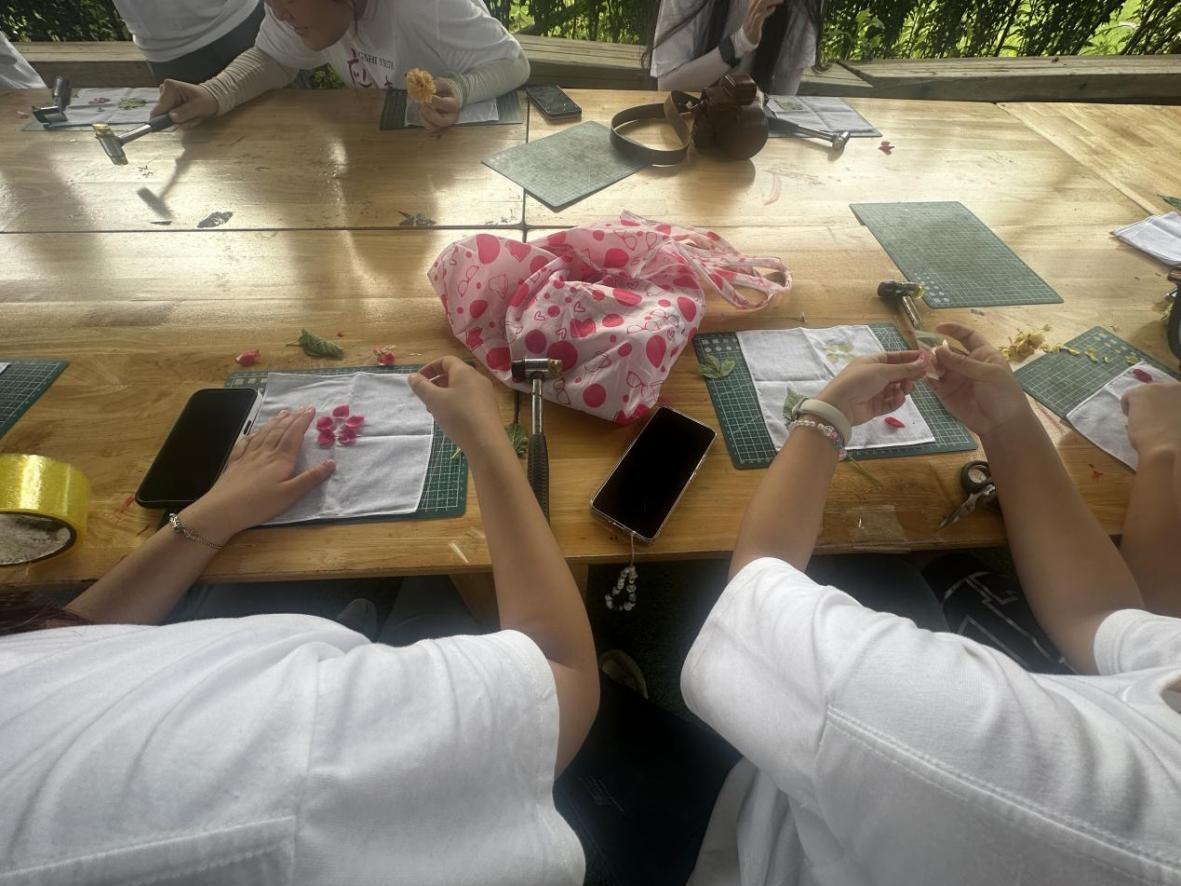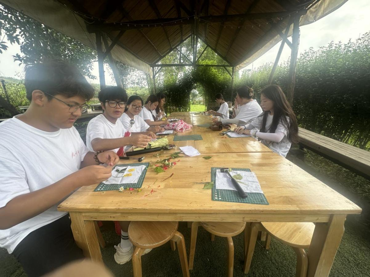 上午,星火实践队在当地生态基地开启植物标本制作活动,在讲解员详细讲解植物采集要点、标本压制与装帧技巧后,星火实践队队员们分组行动开始采集叶片花朵等植物进行制作植物标本。